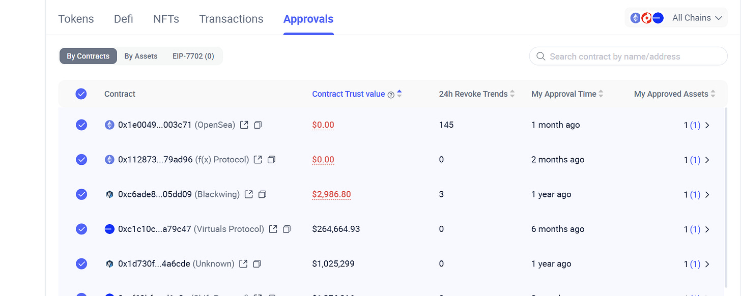 Click on âApprovalsâ inside Rabby and revoke all approvals