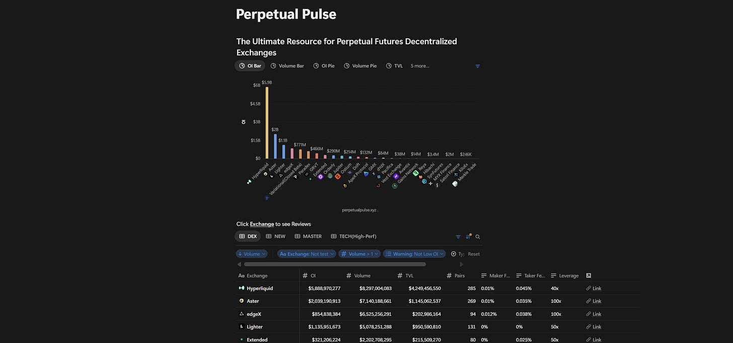 The top perps DEXs by OI, volume, TVL, pairs, and fees