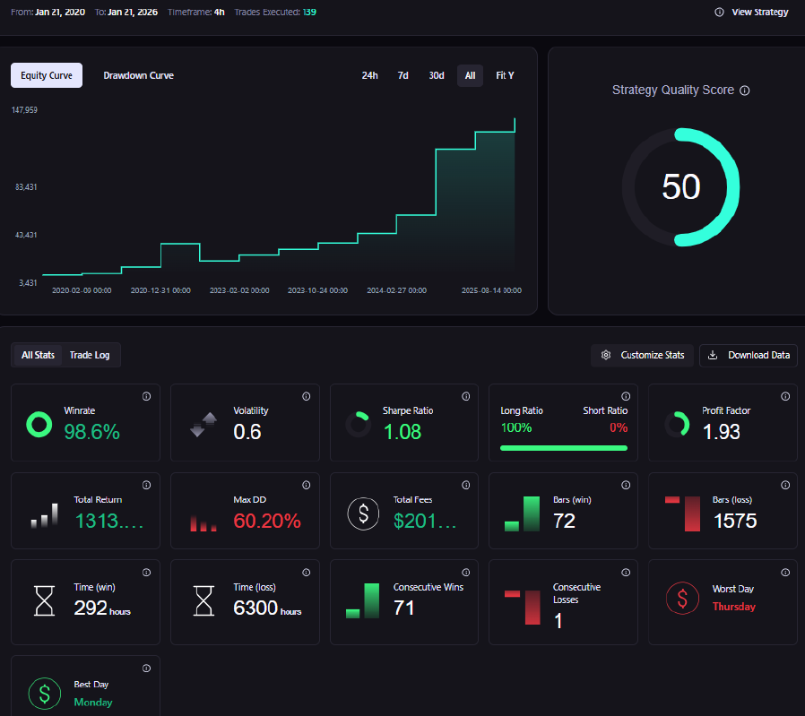CoinQuant lets traders structure ideas into strategies, backtest them on historical, tick-level data across multiple assets, and review performance using consistent, research-focused metrics, not signals or shortcuts.