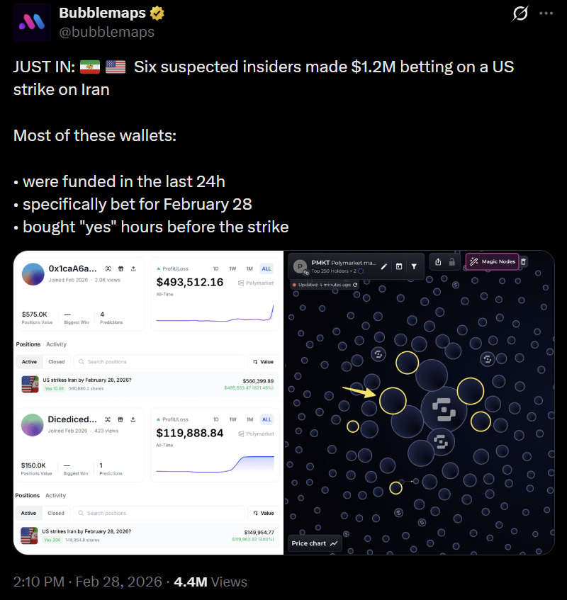 6 suspected insiders made $1.2M betting on a US strike on Iran