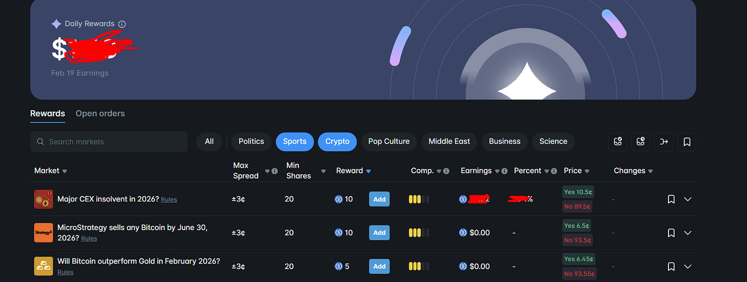 Sort markets by âRewardâ (click on this word) and filter them by the categories you are familiar with (e.g., you can select crypto and politics)