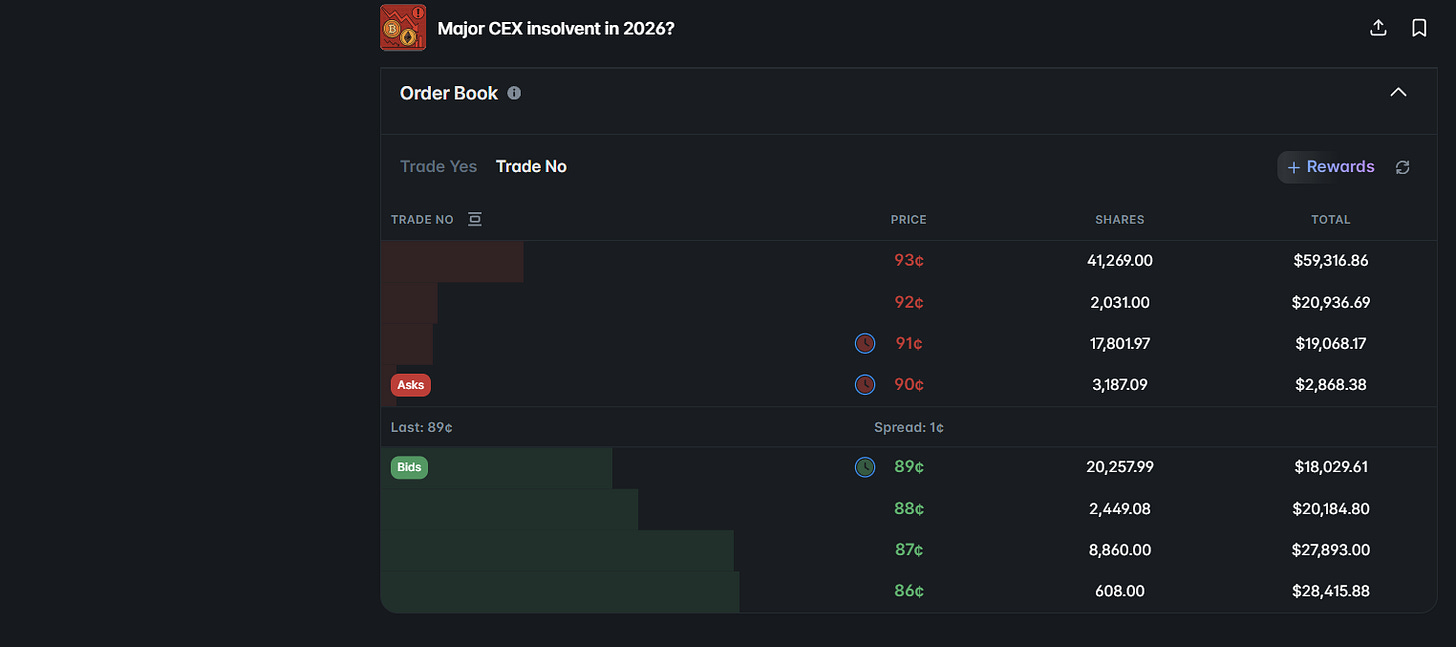 Thereâs a market called âMajor CEX insolvent in 2026?â, which resolves to YES only if Binance, Coinbase, Bybit, OKX, or Kraken will be insolvent by the end of the year.