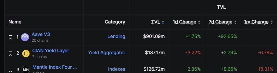 The next one that stood out is Mantle, which had a 175% TVL growth in the past 30 days. Once you click on it, you realize that this is mostly thanks to AAVE’s growth on Mantle, where most of Mantle TVL is deposited