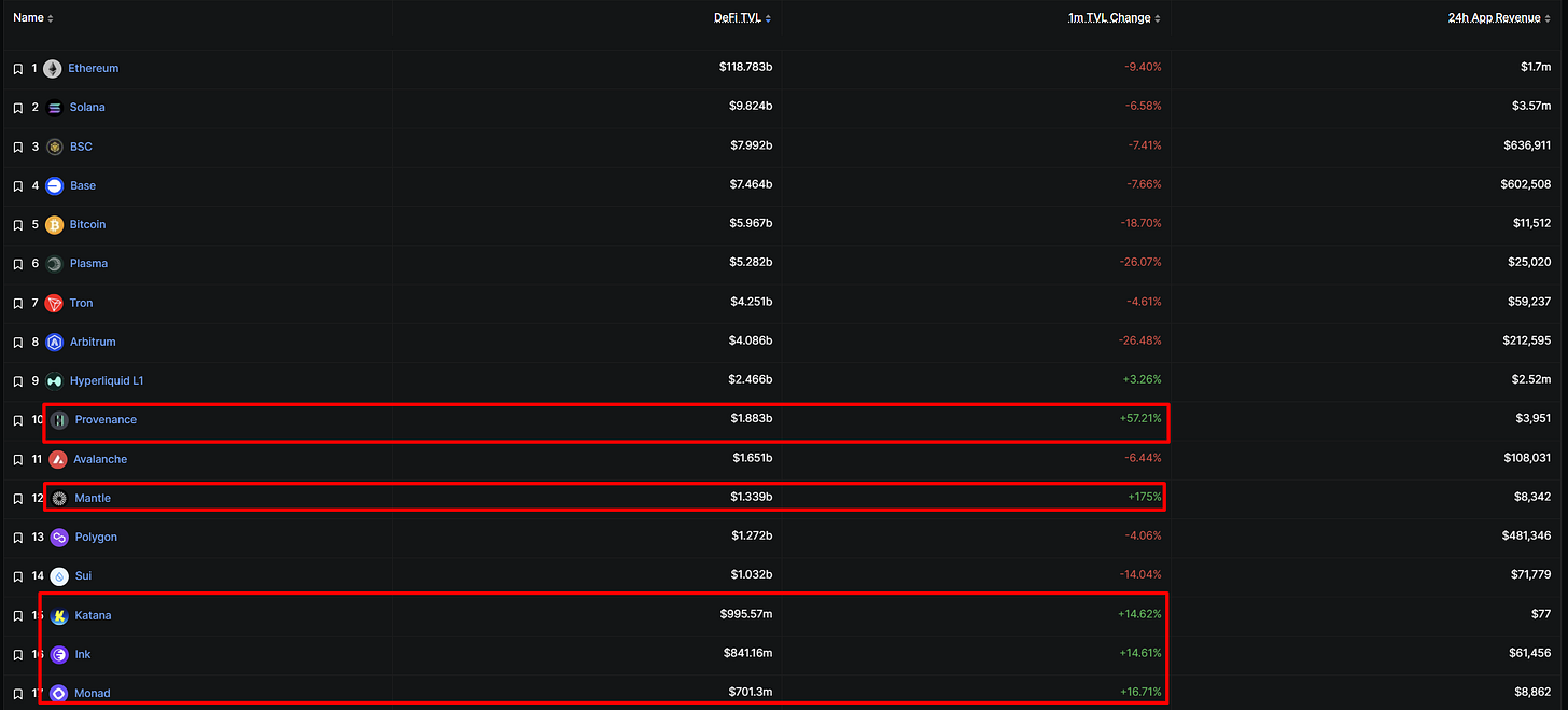 After Mantle, the next blockchains that have seen significant TVL growth over the past 30 days are Katana, Ink, and Monad.