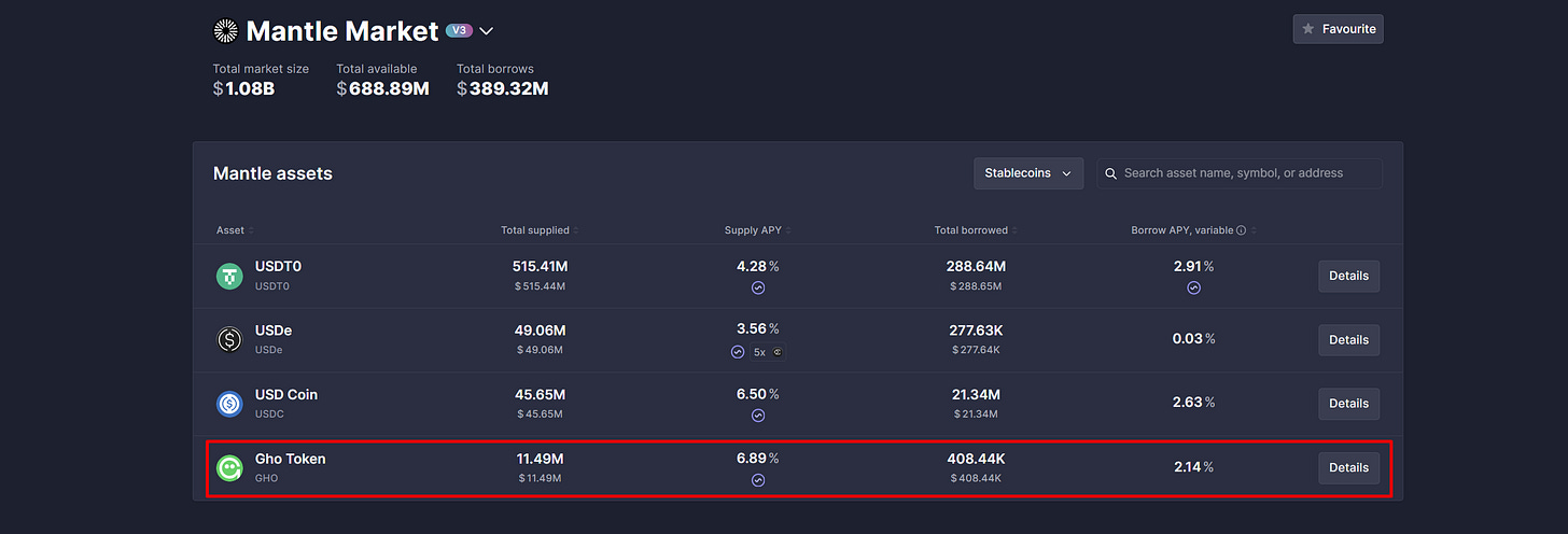 If you go to the AAVE website and select the Mantle market, here you can get 4.28% APY on USDT and 6.89% APY on GHO stablecoin, due to Mantle’s new MNT incentive program, as you can see in the image below