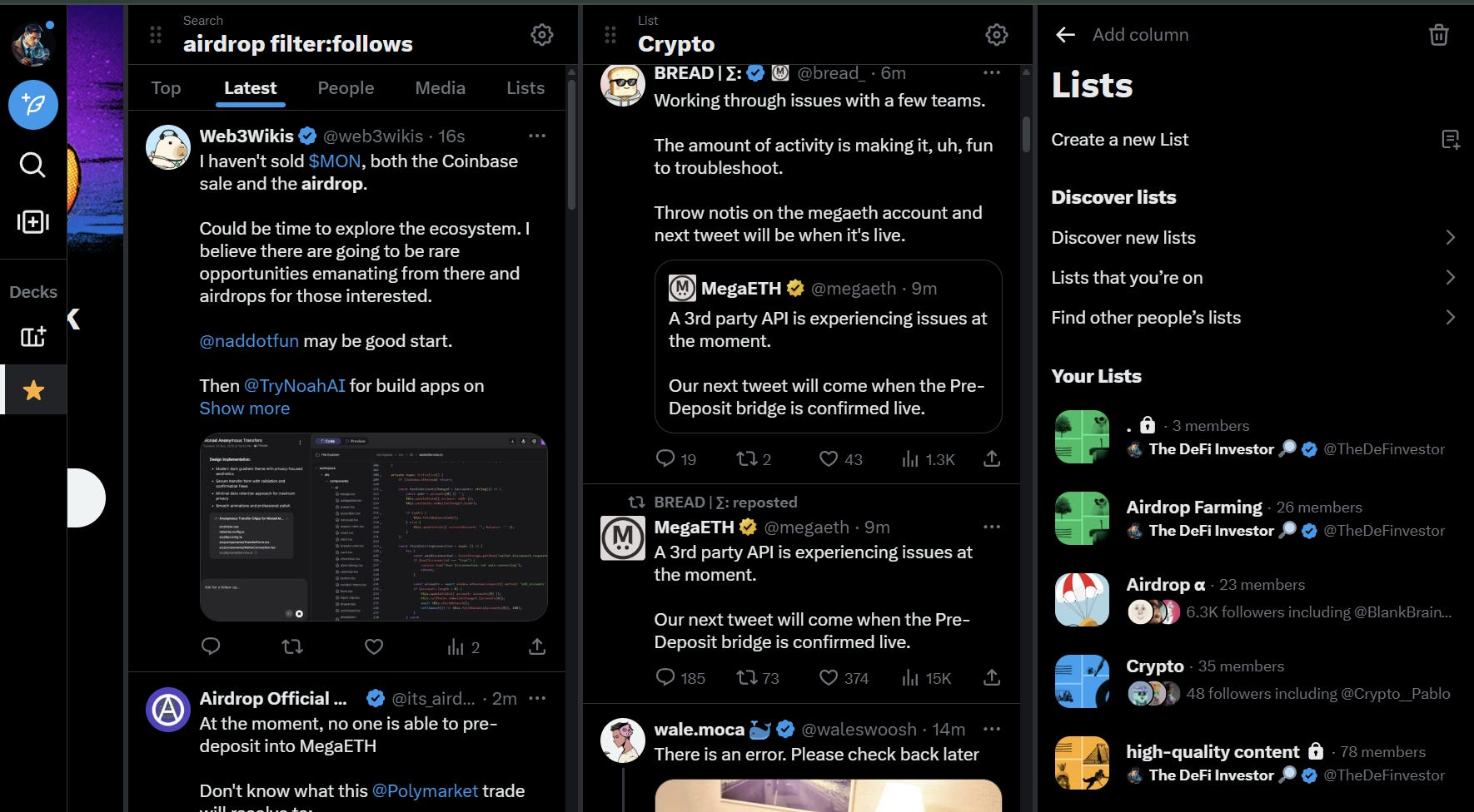 Generally, when I look for posts related to a certain crypto topic, I just search relevant keywords on X Pro using the search bar (e.g. search “airdrop farms”) and filter results to show only posts with at least 10 likes that are from accounts I already follow.