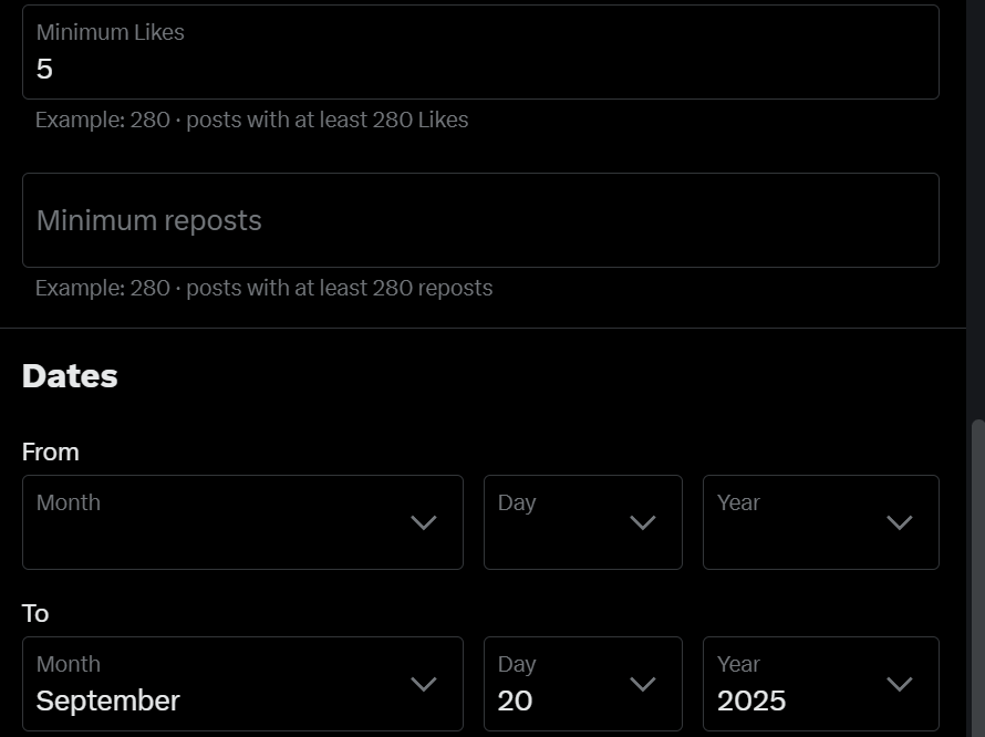 On Advanced Search, select to show only X posts that include the ticker $ZEC, have a minimum of 5 likes, and have been made before Sept. 20, 2025