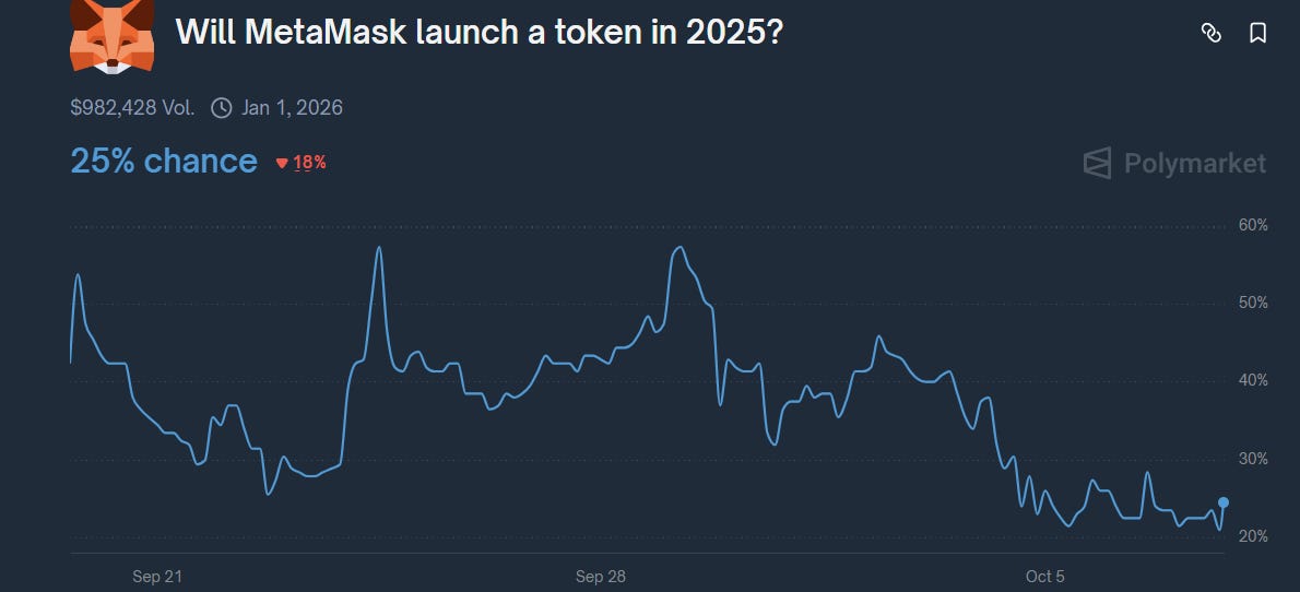 Bought “NO” shares for “Will MetaMask launch a token in 2025?” at 72c - My thesis: Metamask has recently announced plans to launch a points program, and the TGE of 99% of projects historically happens at least 3 months after their first points program goes live (I doubt it will be different for Metamask)