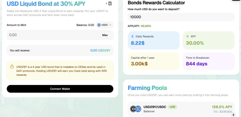 Rezerve recently launched something called “Liquid Bond” (USD29) - a mechanism that channels stablecoin capital directly into ETH - powering treasury growth.