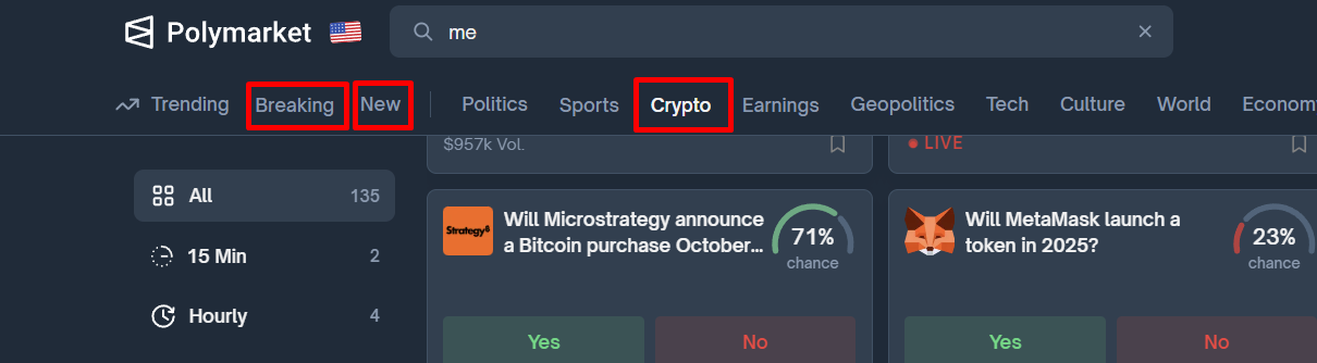 Take a look at the markets in these three sections: “Crypto”, “New”, and “Breaking” separately