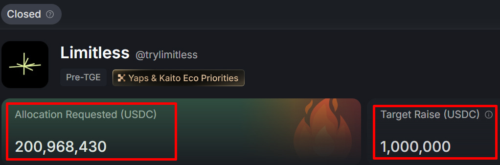 If a sale is 10x+ oversubscribed, Iâd say it is a good sign as it shows thereâs a lot of demand for that token. In the example below from the Kaito Capital Launchpad, you can see that Limitless ICO had a target raise of 1,000,000, and the total requested allocation was over 200,000,000. This shows it was oversubscribed by 200x.