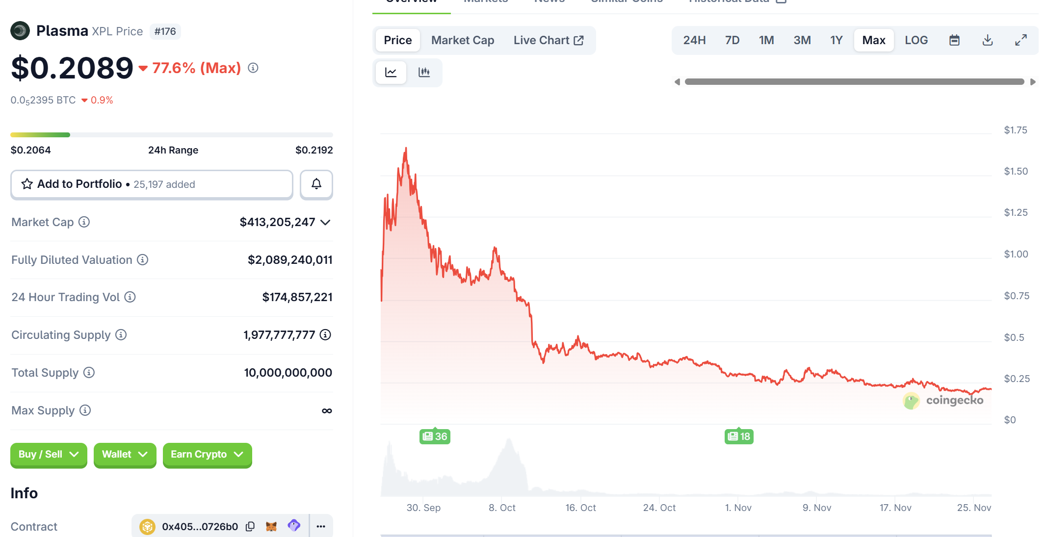 Yet today, only two months after its launch, XPL is down 87% from its ATH, its TVL is going down, and the sentiment around Plasma has turned negative.