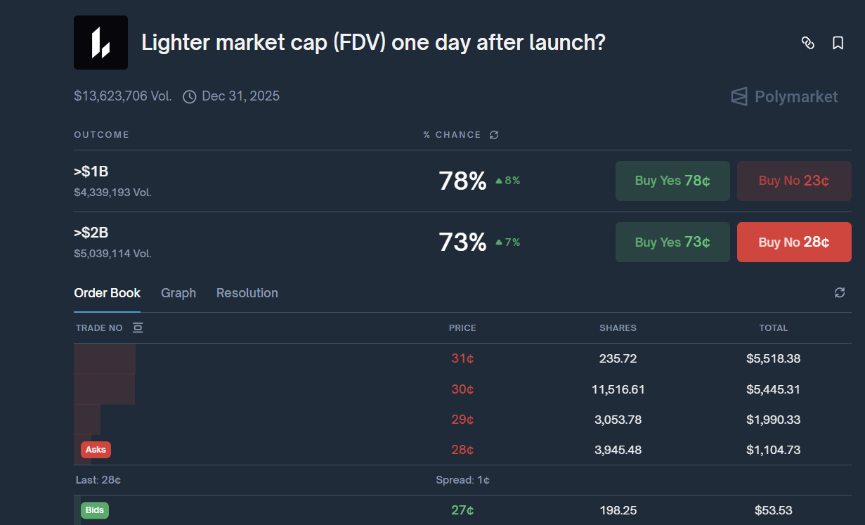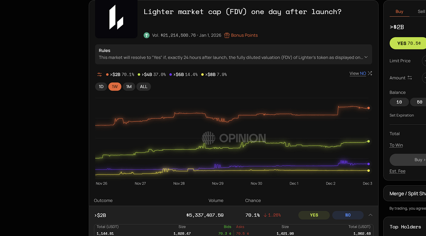 For example, at the time of writing, you can buy YES shares on Opinion betting that Lighter FDV one day after launch will be over $2 billion at 70.5 cents. (70.5% YES probability)