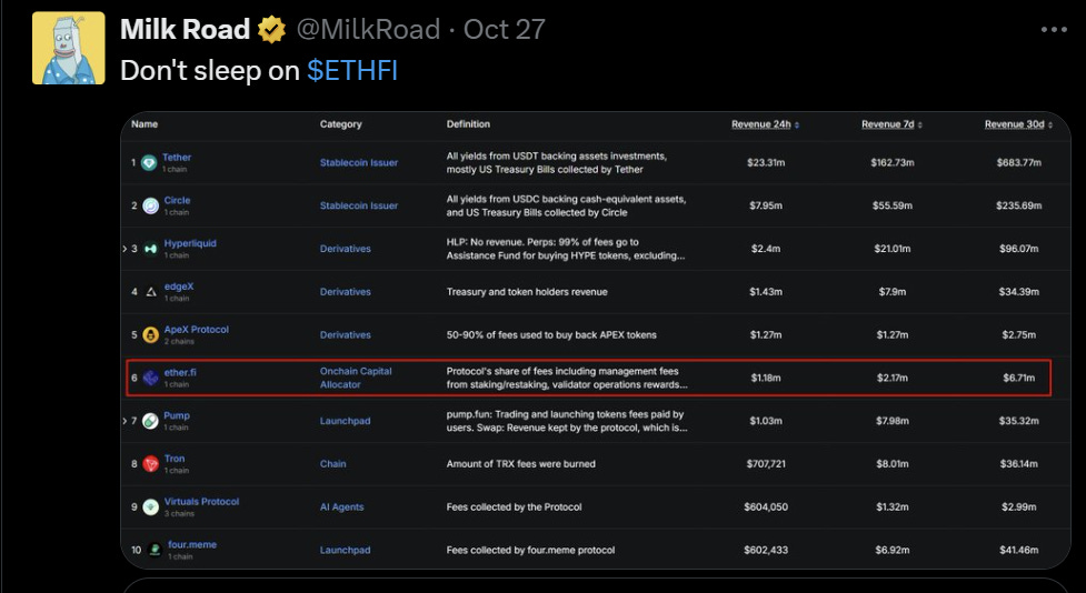 EtherFi quietly became the #6 DeFi protocol by 30-day revenue